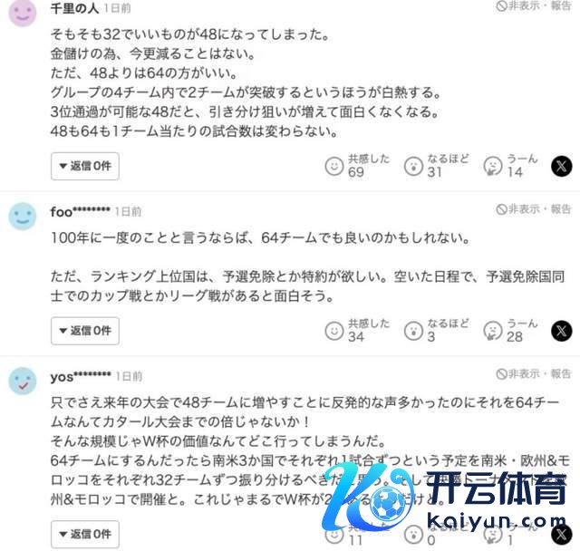 第一个,日本球迷的格调并不是一边倒反对,而是出现了更感性的念念路。一部分球迷承认 32 队的赛制最经典,但既然仍是被扩到 48 队,不如一步到位扩到 64 队。原理很通俗:48 队的赛制允许小组第三晋级,导致球队可能保守踢平,裁减了不雅赏性;但 64 队径直让小组前两名晋级,比赛强度和精彩度反而更高。这么的逻辑确乎让东谈主目下一亮,不少中立球迷也以为比 48 队更合理,归正小组赛舍弃皆是 32 强。