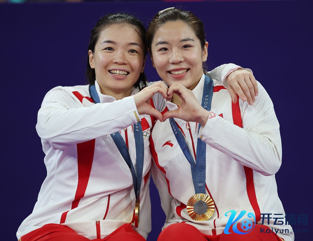 2024年8月3日,冠军陈清早(左)/贾一凡在巴黎奥运会羽毛球女双授奖庆典上合影。新华社记者 陈斌 摄
