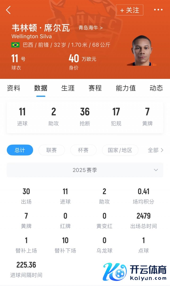韦林顿·席尔瓦现年32岁,2025赛季他代表青岛海牛出战30场,孝顺11个进球和2次助攻。
