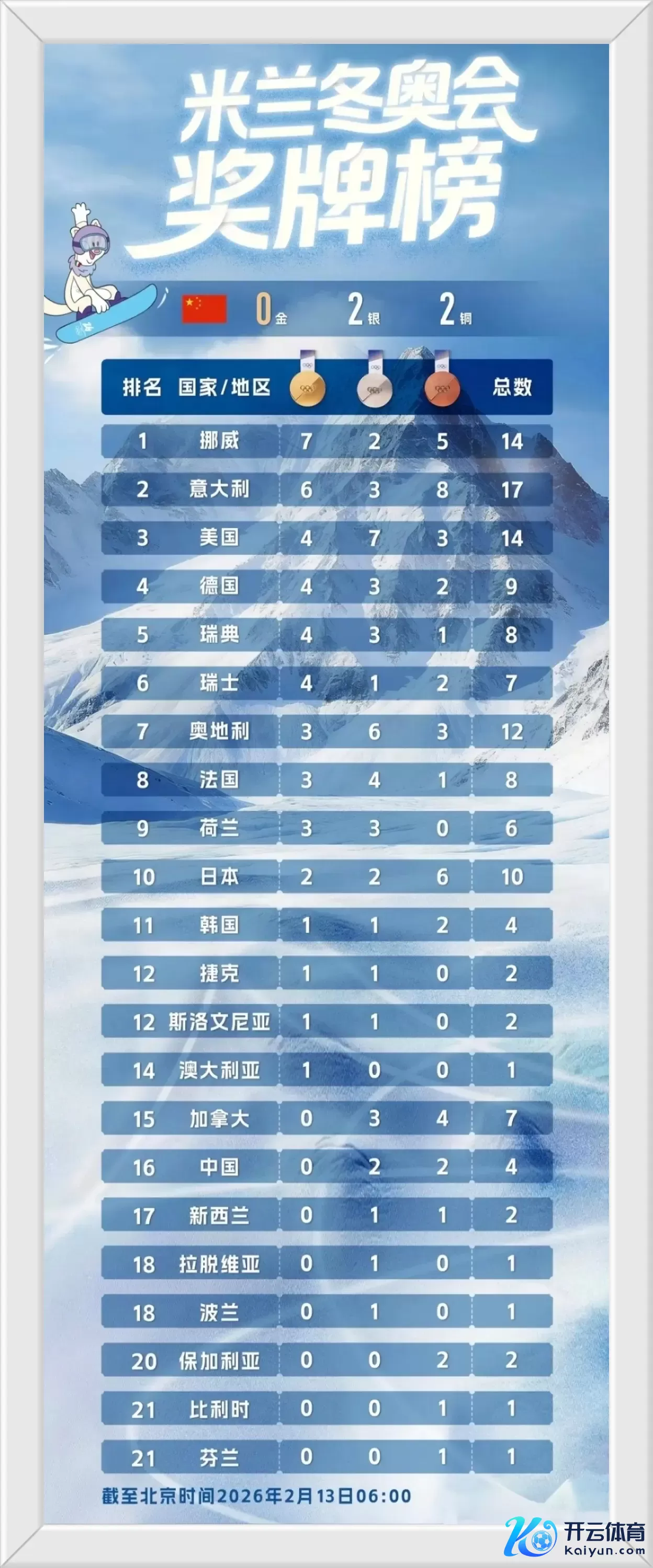 附最新奖牌榜资讯,具体如下:(抵制至北京时期2月13日)