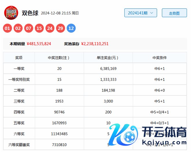 双色球第2024141期开出奖号为01、02、07、15、24、29+12。其中红球奇偶比为4:2,三区比为3:1:2,大小比为2:4体育赛事直播,蓝球开出大号12。